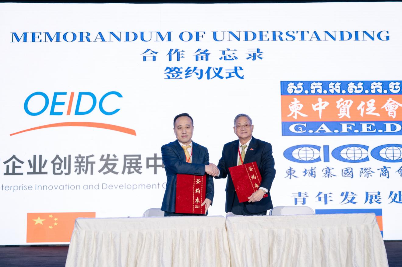 图:东方企业创新发展中心姜洪成主任与RCEP产业合作委员会柬埔寨执行主席毛信勤签署合作备忘录